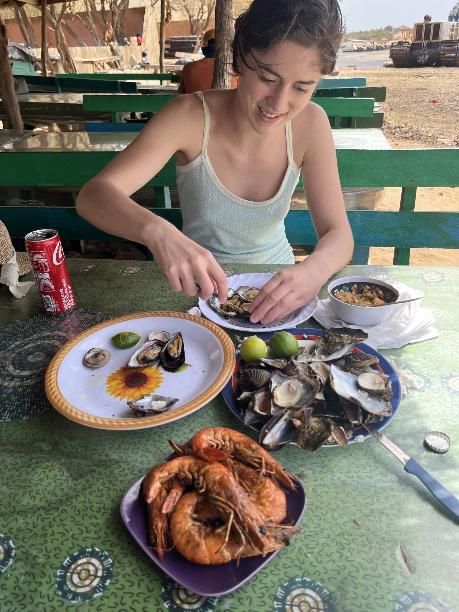 They are works of art that would not be out of place on an exam. Near the water, canopies have been made. There is a breeze from the lagoon, the tables are decorated with tablecloths and plastic nailed over them. They are apparently different trades, because the ladies do their best to get us to join them at the table. We choose to sit under the canopy. The ladies are from a village on the other side of the lagoon and have a license to grow and sell oysters here. Senegalese French is even more complicated to understand here, fortunately there is one lady who can just speak French.